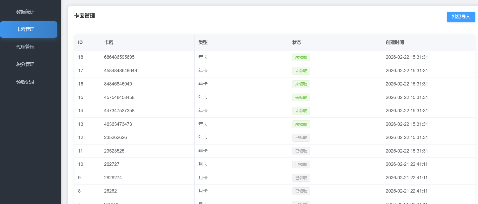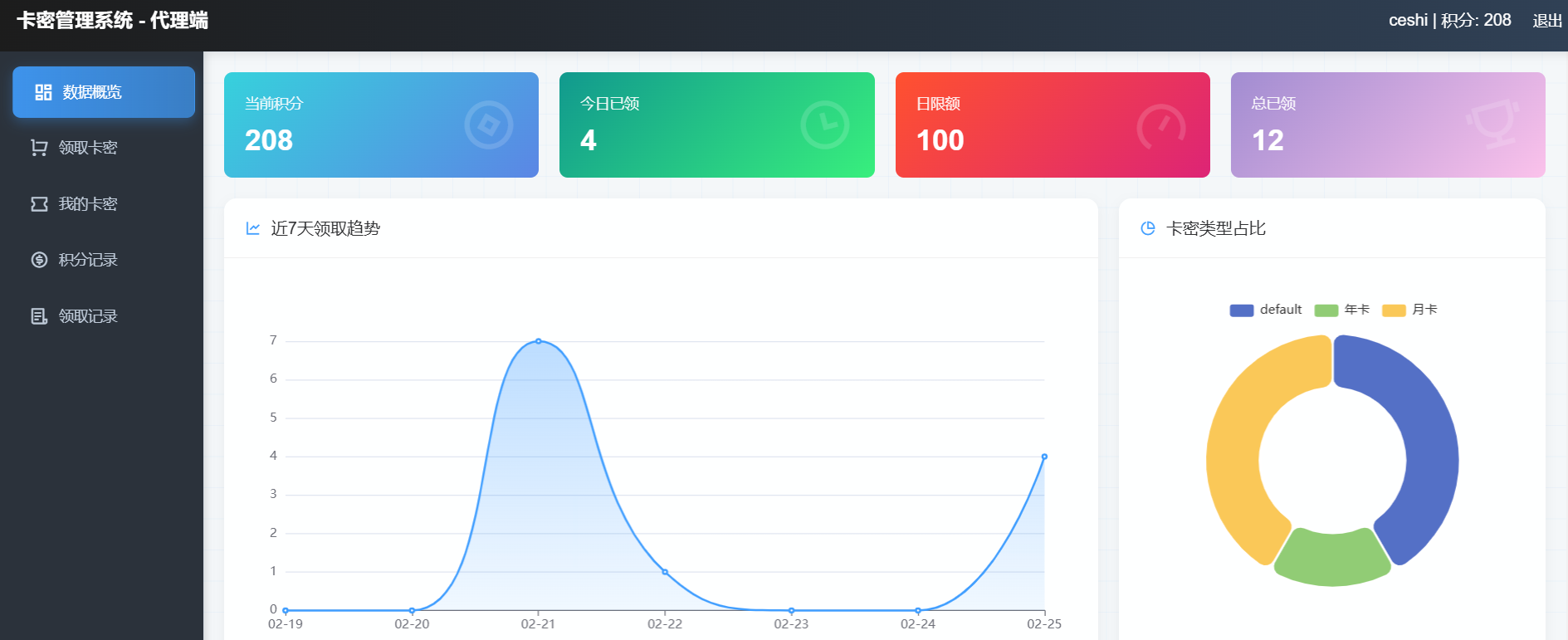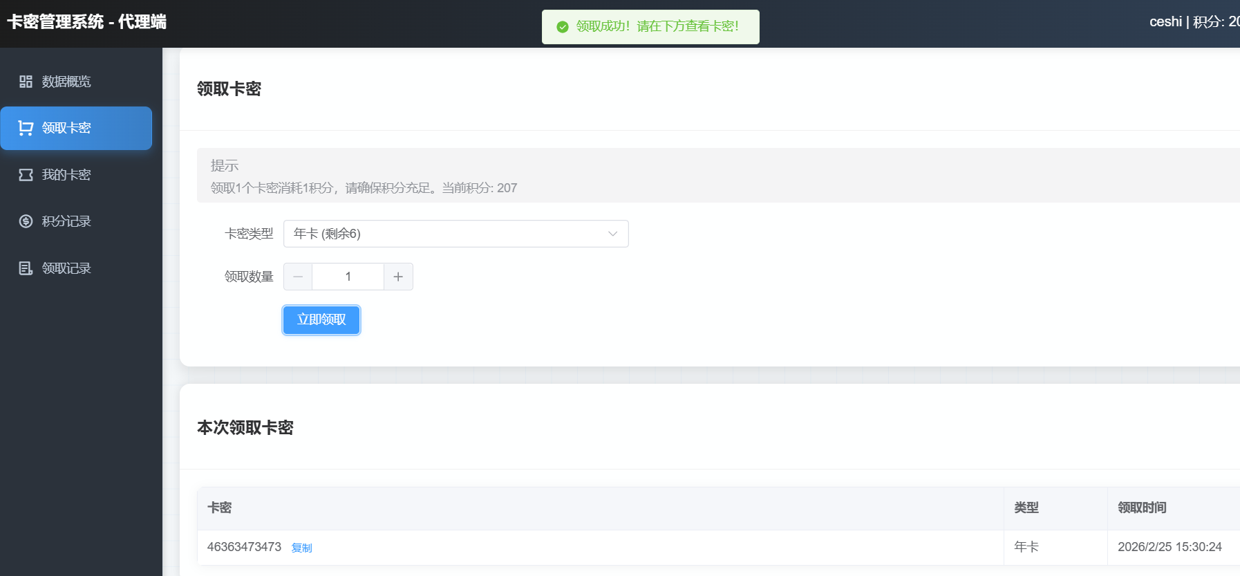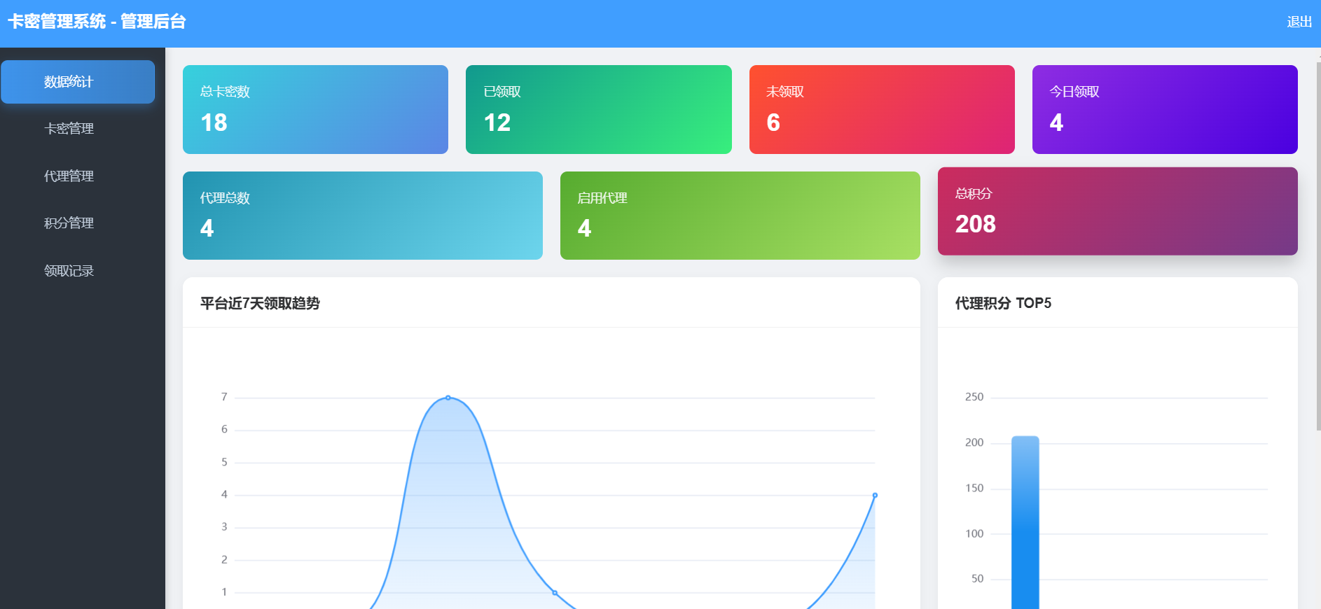 卡密管理系统,支持积分体系、代理管理、批量导入等功能,开源。总后台:https://yytx.ys.youmahx.cn/view/admin/index.htmladmin admin123代理后台:https://yytx.ys.youmahx.cn//view/agent/index.html