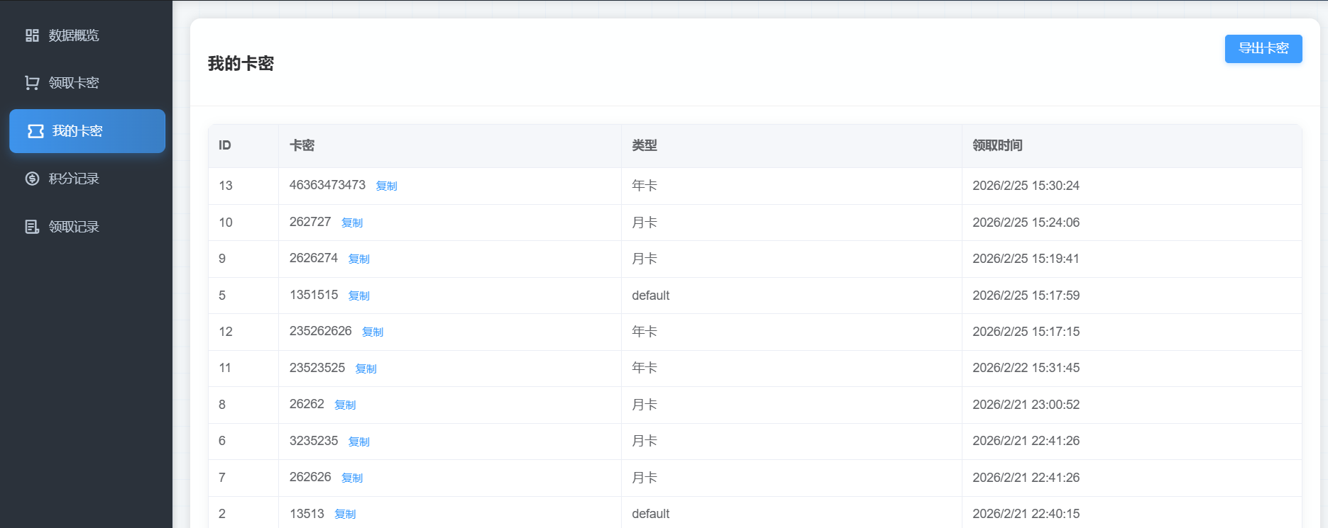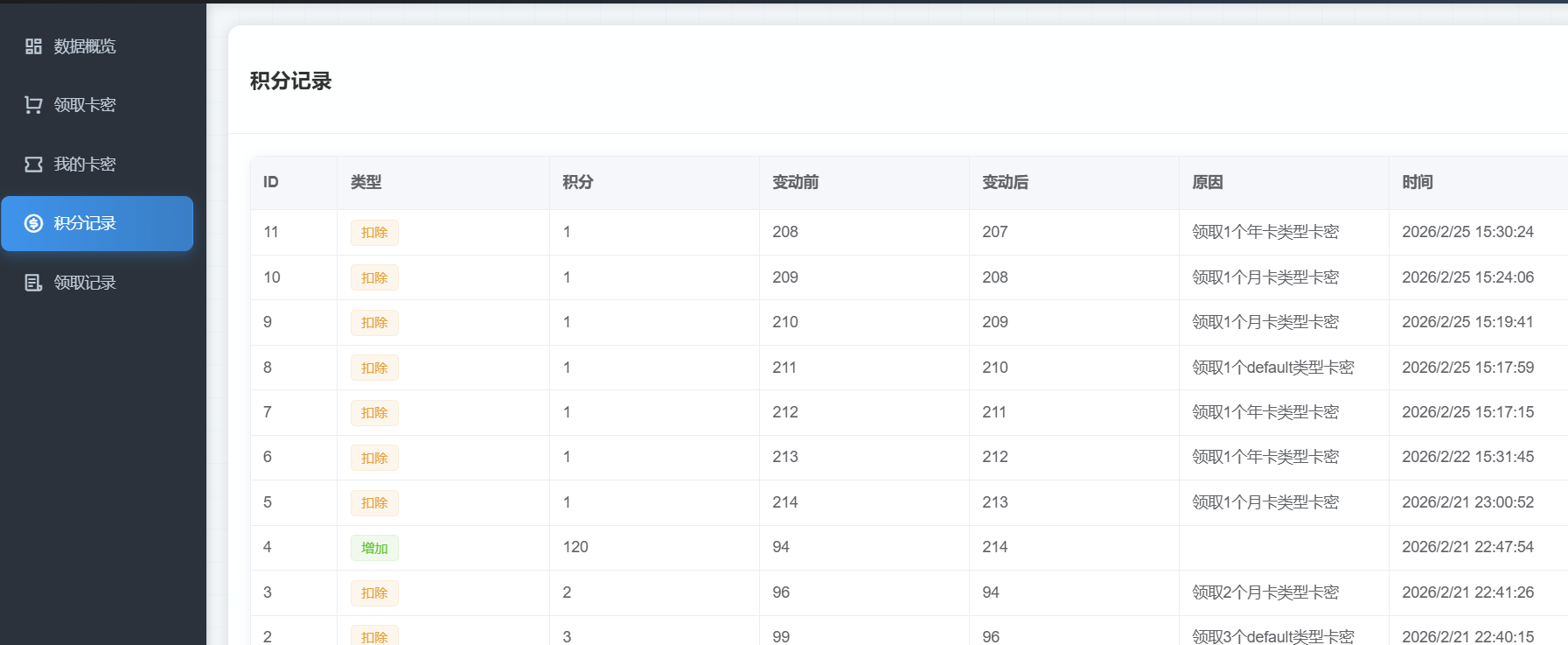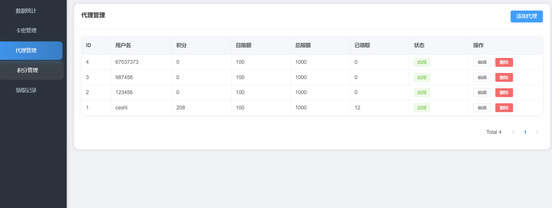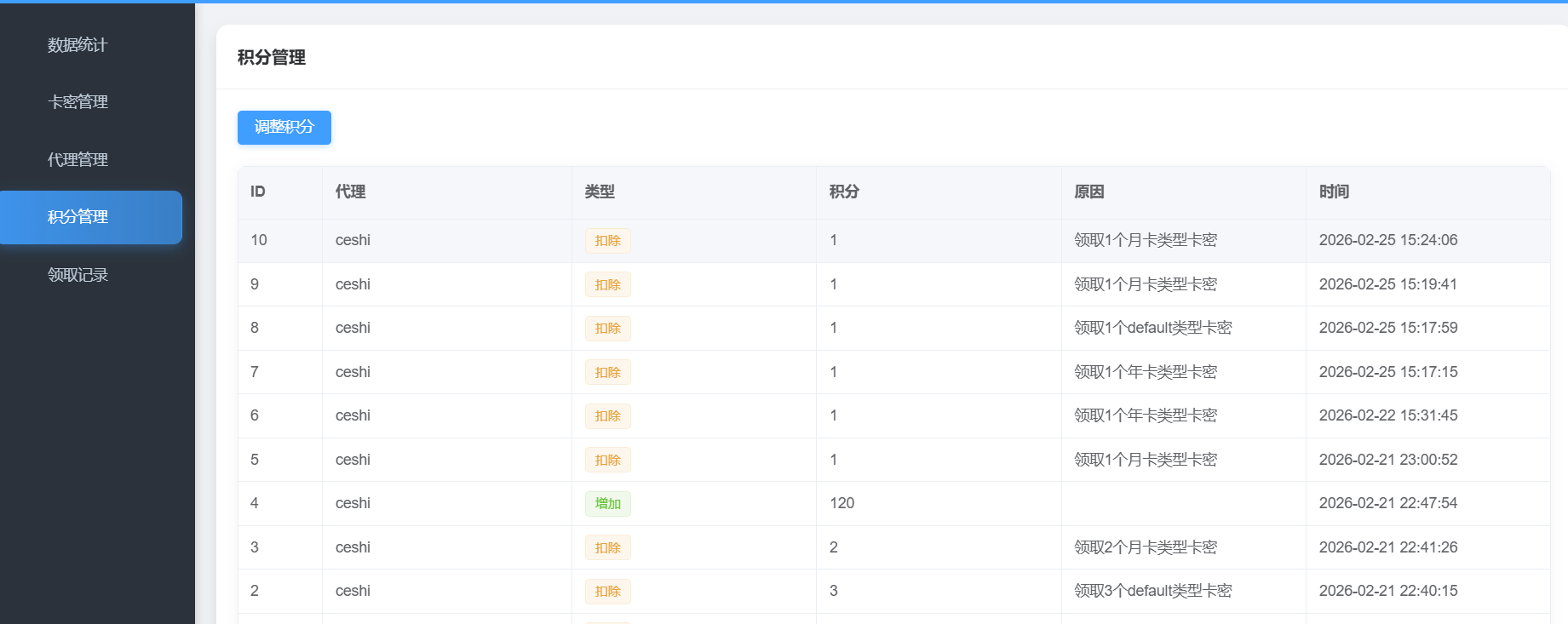 卡密管理系统,支持积分体系、代理管理、批量导入等功能,开源。总后台:https://yytx.ys.youmahx.cn/view/admin/index.htmladmin admin123代理后台:https://yytx.ys.youmahx.cn//view/agent/index.html